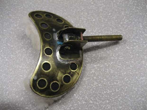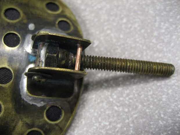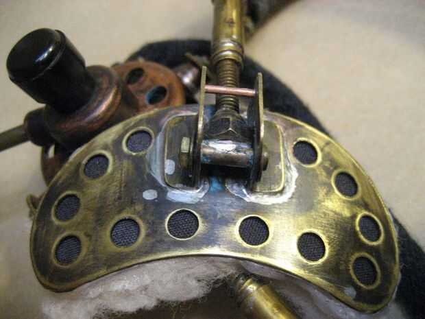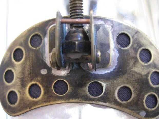 Ahora estás listo para terminar el ensamblaje de la almohadilla del templo. Deslice los soportes en la tubería de latón 1/8" corto luego coloque sobre la plataforma del templo. Hace que todo esté centrado y sudor de la soldadura de los soportes en su lugar. Después de que las partes se han enfriado, la rótula axial ahora debe pivotar en el cojín del templo. Tome un pedazo corto de alambre de cobre y deslícelos a través de los agujeros y soldar en su lugar. Corte la parte sobrante y limar plano. Por último, perno de una 2-56 3/4" largo latón tornillo y una tuerca a través del tubo de latón de 1/8". Cortar un trozo de tela negra y piel de oveja sintética en la forma de la almohadilla del templo y pegar éstos al interior superficie.