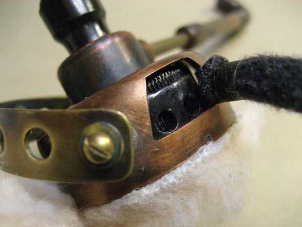 El cable que va hacia el sistema telefónico fue cubierto en un cordón de algodón de viejo sudor pantalones. Después de se deslizó el lazo sobre el cable, cortar pequeñas tiras de latón y me envuelve una banda alrededor de cada extremo. Me resbaló el cable por un agujero en la tapa de la botella de agua y corte una ranura correspondiente en el casquillo de Excedrin. Dentro de la tapa de la botella me corte una tira pequeña de latón y sujeta el cable al actuar como un alivio de tensión.