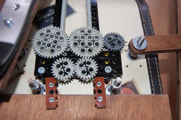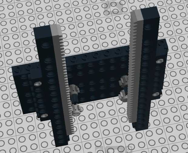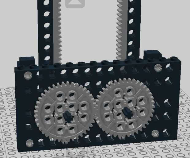 El principal mecanismo es un sistema de estante y del piñón para cambiar la rotación en un movimiento lineal, e hice doble para la estabilidad y fuerza. El resto es simplemente un sistema de engranaje de reducción, rematado por un motor de PowerFunction con un engranaje de deslizamiento (para evitar el sobrecalentamiento cuando se alcanzan los extremos del rango de movimiento del mecanismo).