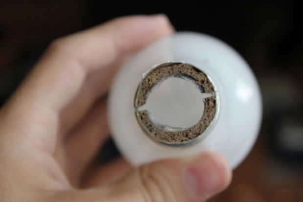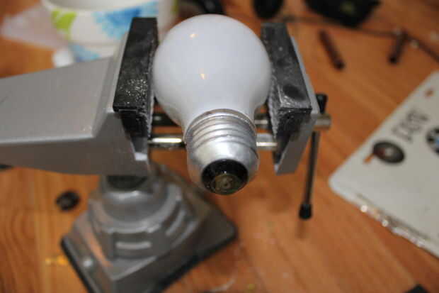 Coger la dremel y cortar la parte metálica de la bombilla que hay mitad de una pulgada de rosca izquierda en él. Después de eso te darás cuenta que hay un tubo de vidrio en el centro, terminé sacando con un clavo pero tienes que ser cuidado completo para no romper ningún els cosa además el tubo de vidrio. Después de usted puede sentir libre de hacer la ranura de moneda con cualquier problema.