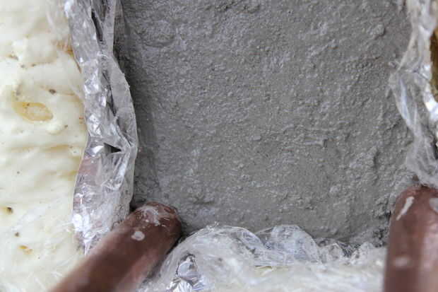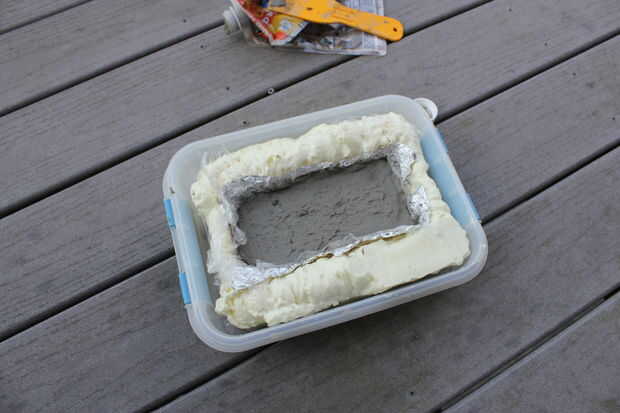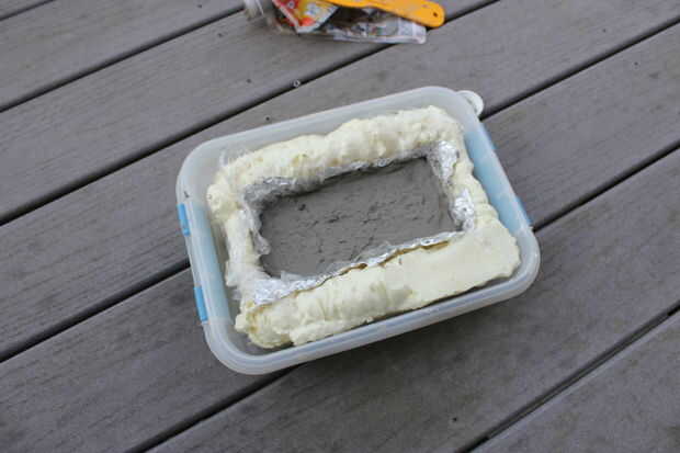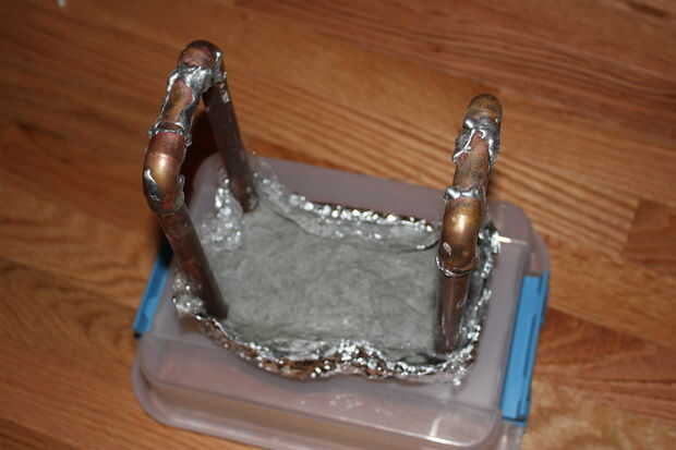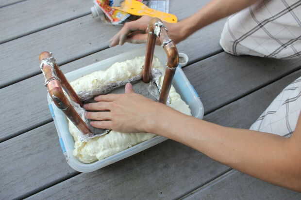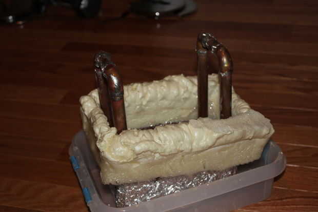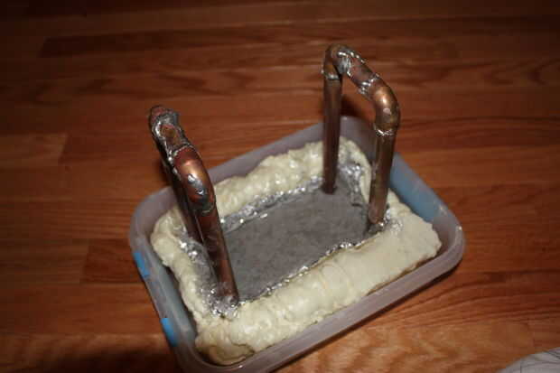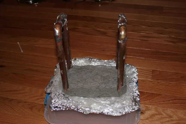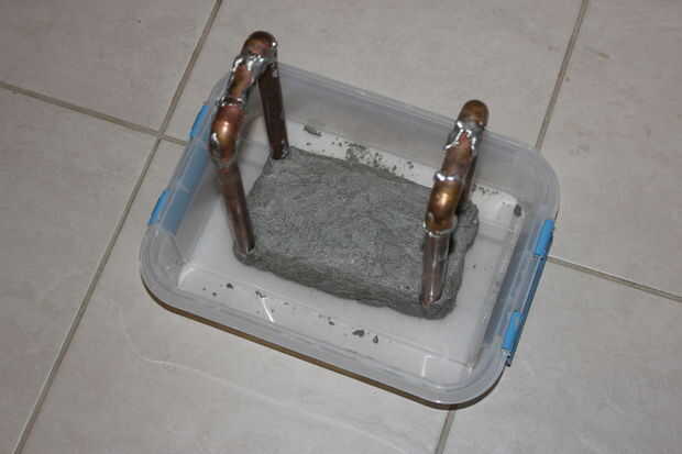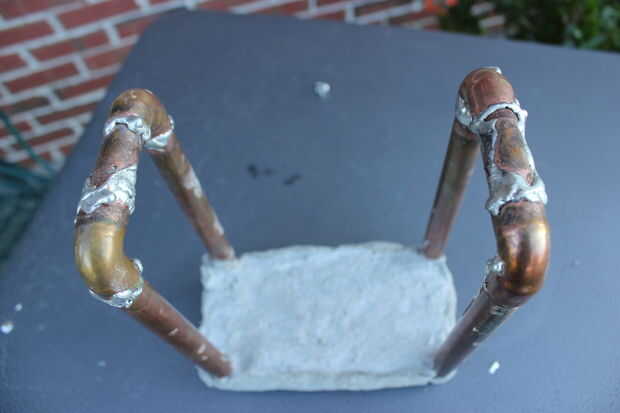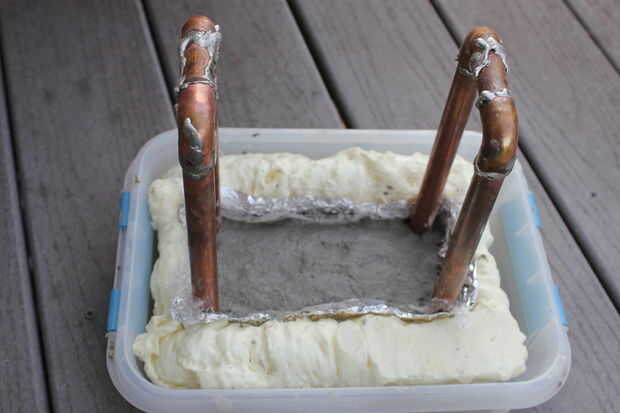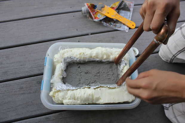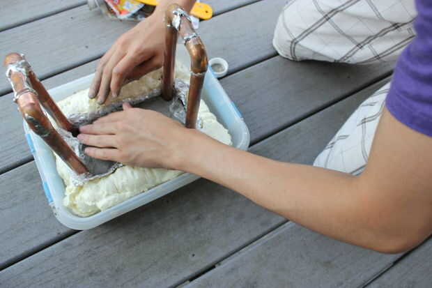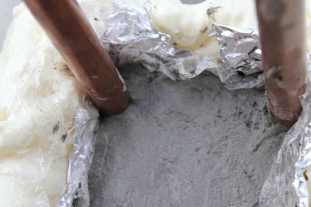 Desea tomar el molde de grandes cosas y línea con envoltura de plástico, su concreto premezclado y viértala en a sobre la altura de un ladrillo, después de hecho lugar el cobre de la pipa dentro que significa estrecho hacia arriba y vertical. Utilice las fotos a continuación como referencia. espere unas 8 horas y simplemente deslice el molde grandes cosas de la parte superior. y quitar el plástico que la rodea.