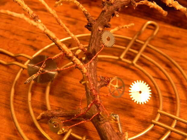 Tenga en cuenta, utilizando el alambre, realmente puede crear ramas extras para el árbol. Además, tenga en cuenta el color de los engranajes que está utilizando. Yo sugeriría usar solo oro/latón/cobre, pero con mi árbol no tengo la opción para hacerlo. Terminé usando engranajes que fueron oro/plata/cobre, que no mantienen el color totalmente consisant, pero yo todavía creo que es impresionante.