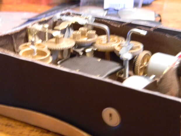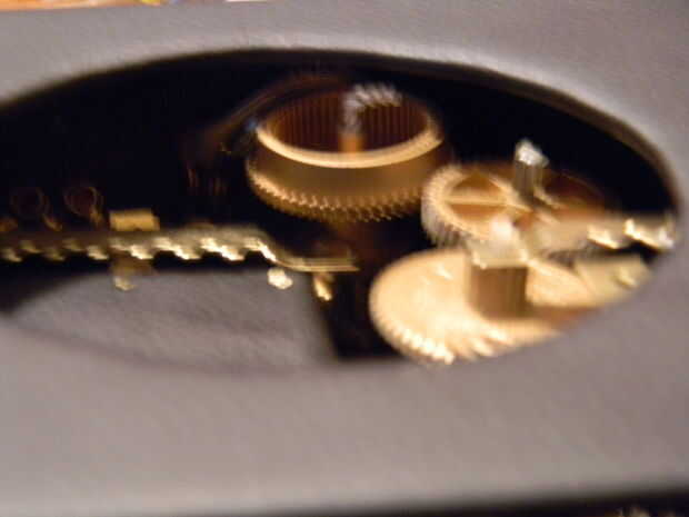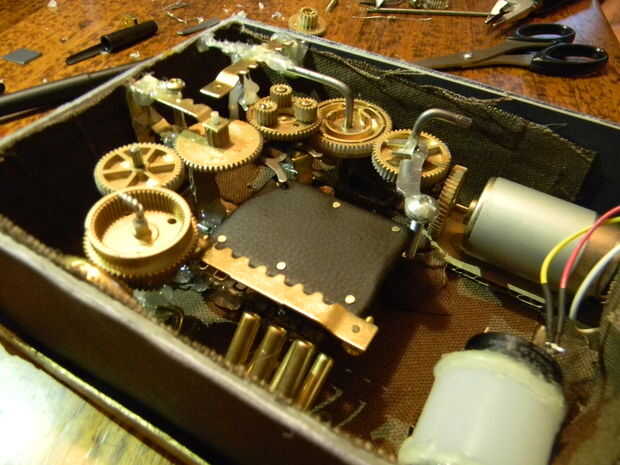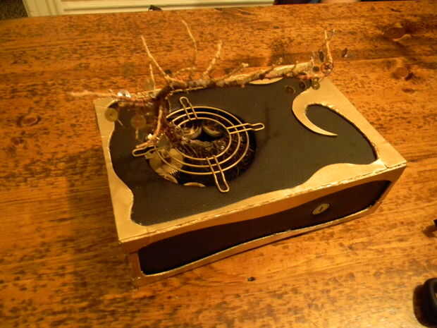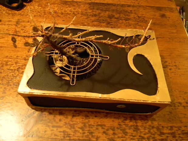 Tomar su árbol y ponga las raíces a través del orificio en la parte superior de la caja. También he añadido una cinta de oro (pintada con spray) alrededor de la base del árbol para efecto añadido. Con las raíces del árbol en su lugar en la parte inferior de la caja del pegamento pegamento caliente (y algunas pequeñas baratijas para que se vea bien). Prueba el sistema de engranaje ahora para asegurarse de que las raíces no molestan los engranajes girando y viceversa.