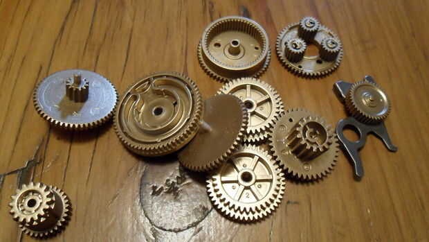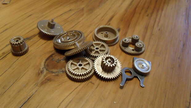 Una vez preparado, o no, tomar la pintura en aerosol oro/latón/cobre y tienen un go en todos los engranajes y lo que otros componentes que desee en estos metálicos. Tenga en cuenta, usted querrá alguna varianza. He utilizado oro para todos mis grandes engranajes, pero el hierro de los ejes de la izquierda y ha añadido algunos cobre y latón más adelante para la buena medida.