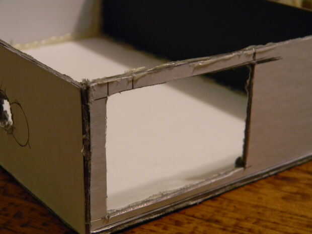 Para el tercer lado, gire la "caja" en su lado y el lugar el nuevo lado del pedazo entre las dos partes existentes, para que se sienta en la base. Utilice la pistola de pegamento caliente para poner pegamento entre todas las ranuras para bloquear esta pieza en su lugar. Repita para el lado del pasado.