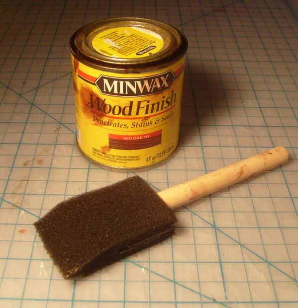 Uso su madera mancha de elección, dependiendo de qué color te está buscando. (Supongo que también se podría utilizar la pintura, pero soy generalmente reacio a pintura madera). Utilicé las últimas gotas de Miniwax marca roble #215, que tenía restos de otro proyecto. Literalmente utiliza las últimas gotas y funcionó hacia fuera cuando estaba terminando el último panel, razón por la cual se ve un poco delgada y manchada en el panel lateral de la base de soporte remoto.