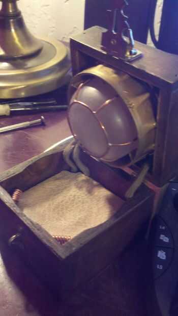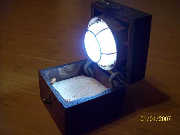 En el proceso de adorno. Hice cuatro bobinas de cobre envolviendo el alambre alrededor de un pasador y pegados en cada esquina (también sirven como asas para sacar el fondo falso). Te quieres teñir el cuero y añadir más bits y sacudidas en el exterior de la caja. Opté por un look muy sencillo. Que parece ser nada más que una caja de joyería ordinaria cuando está cerrado, pero puedo añadir más en el futuro (agregare fotos si lo hago).