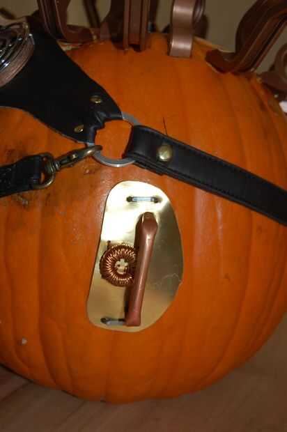 La base de la oreja fue de un recipiente de latón que destruí para cortar la pieza.   Perforé un conjunto de agujeros alrededor y dentro el anillo de alambre de cobre (de una fuente de alimentación) y utilizando alambre de cobre roscado en la base.  He doblado el tubo de cobre y lo suficiente para sostener dos tornillos que se perforan aunque de la parte posterior pellizca.  A continuación unos agujeros perforados y usa grapas de calibre grueso (usadas para la construcción) para fijar la oreja a la calabaza.  El pelo es algunas partes utilizados para retención del cable gabinete servidor, aerosol pintado cobre y entonces se inserta en los agujeros perforados en la calabaza.