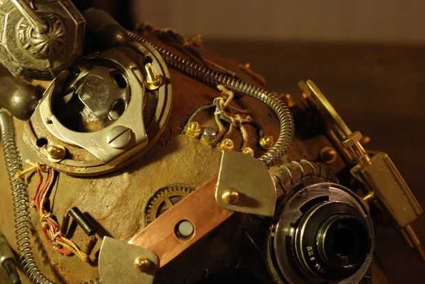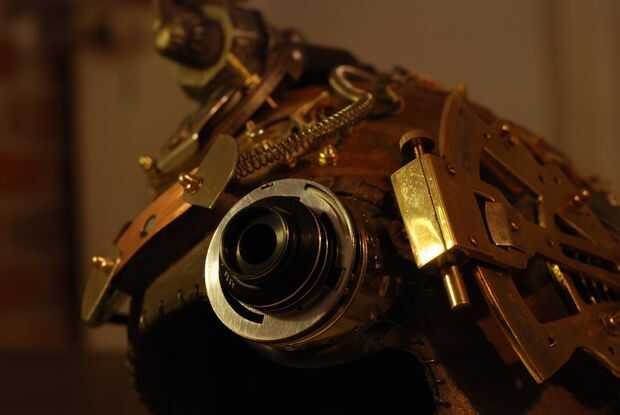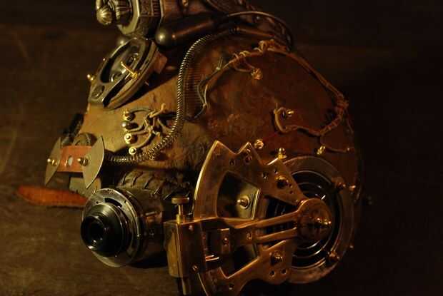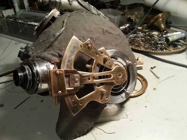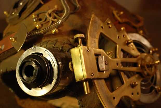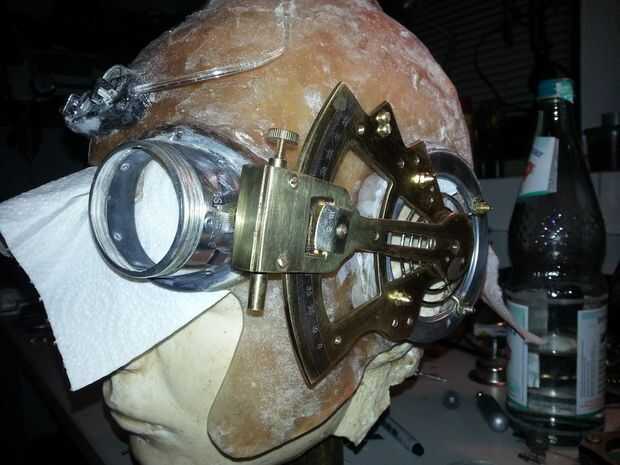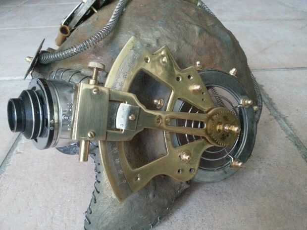 6. la parte de la izquierda es un sextante antiguo, de bronce. El "ojo" es un lente de una cámara vieja.