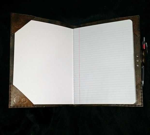 El interior la cubierta tiene las esquinas del triángulo cosidas en hacerlo fácil agregar y quitar los cuadernos. Los remaches de la parte posterior de la correa de sujeción son extra pequeños y los broches de presión 5/16".