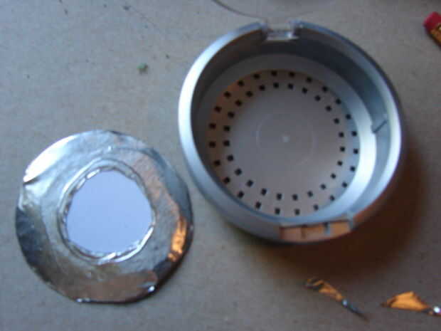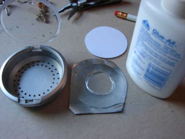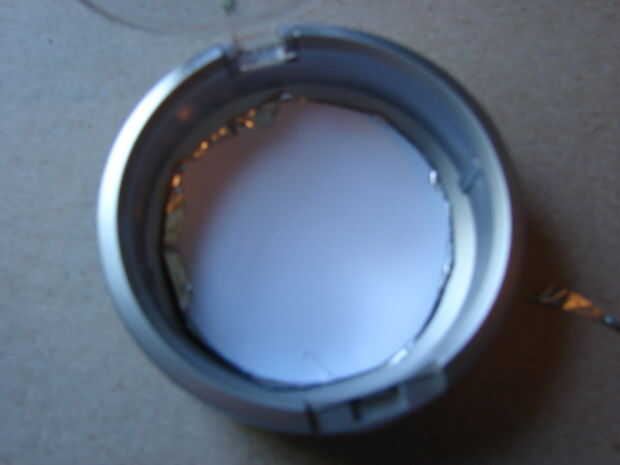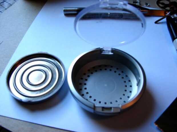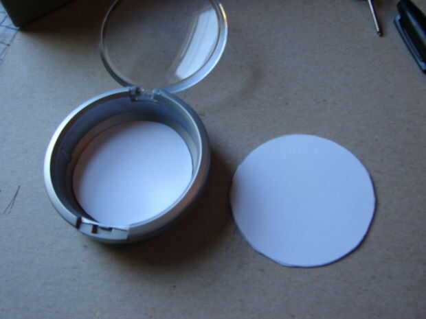 Traza en cartulina y cortar dos círculos de la bandeja que quita. Lo más probable es que la parte inferior de la compact es más pequeña que la parte superior. Recortar un círculo para que se sienta en la parte inferior.