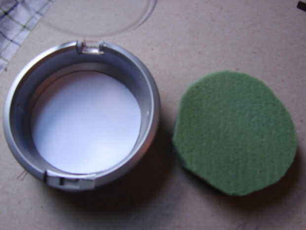 Cortar un trozo de espuma. Esto debería ser alrededor tan grueso como la mitad de la profundidad de su compacto. Todos los cachitos de cosas serán pegados en él, por lo que debe ser tan grueso como posible permitiendo espacio para los bits y piezas de la cara. Espuma floral es mejor porque cede a la presión (brocas más grandes pueden ser hundidos en ella), y aferra a inserta objetos bien (mejor, está diseñado para). Con tus círculos como guía, corte en el tamaño adecuado para caber apenas tímido de comodamente en el Pacto. Debe tocar la parte inferior.
