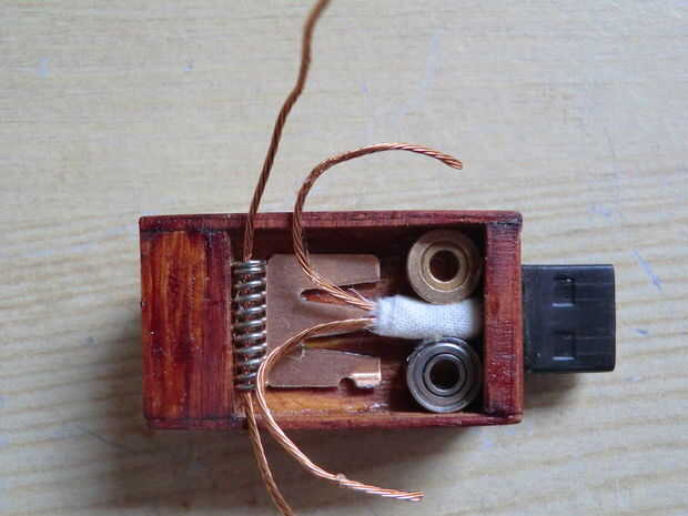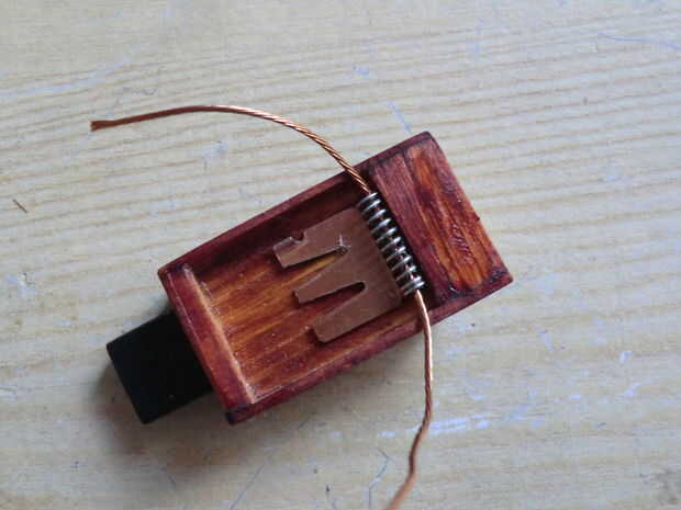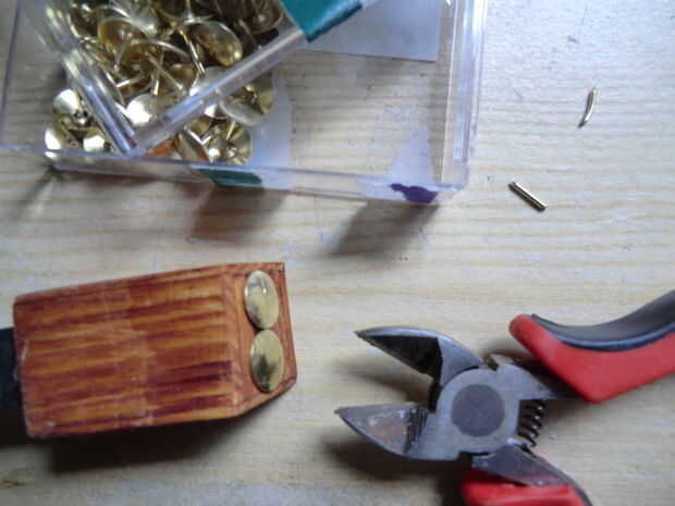 Los postes de dos latón de la parte trasera de la palanca donde formado por corte de pernos de latón acabado chinchetas con un alicate que las cabezas de los pernos se fijaban con pegamento