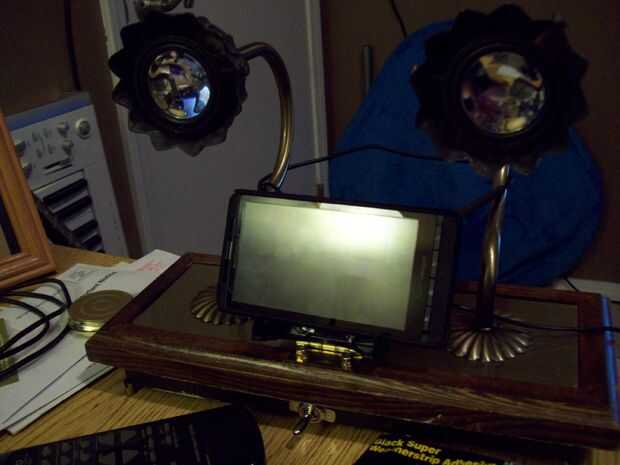 La bandeja de plástico negro montada en el frente solía ser la base del amplificador mp3. Yo muescas en los lados así que encajarían en mi Droid X y Sansa.