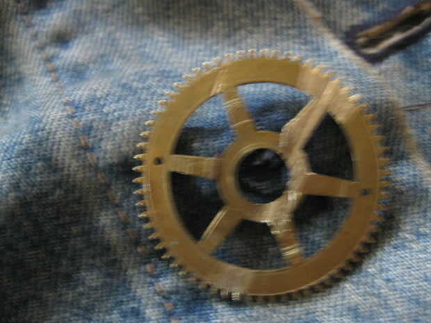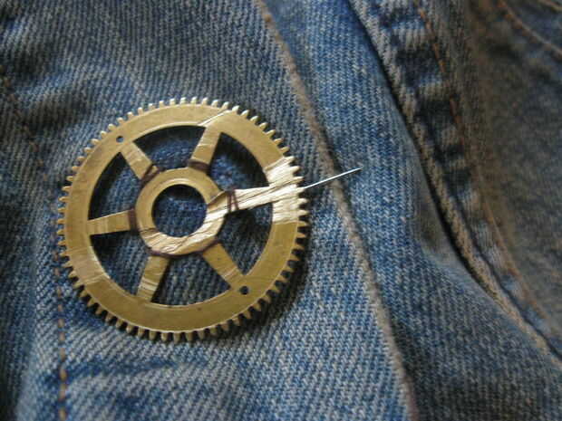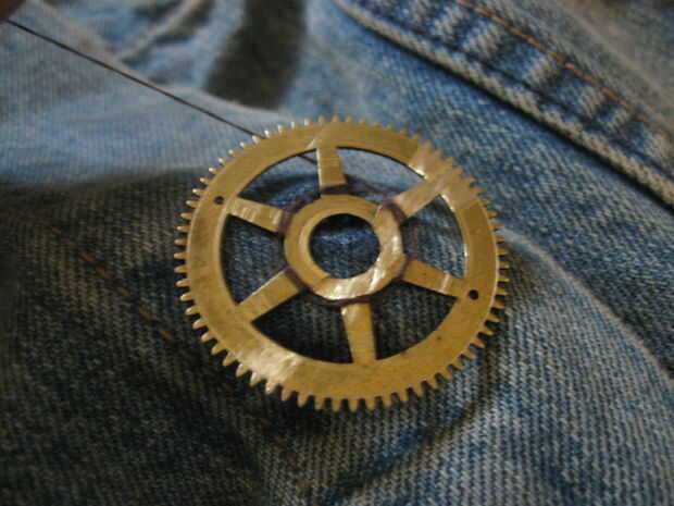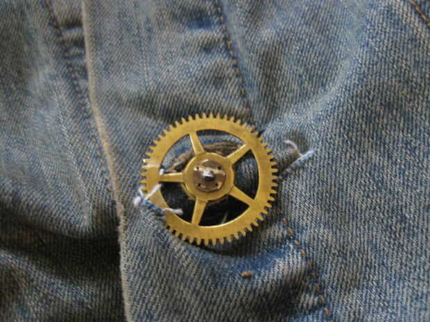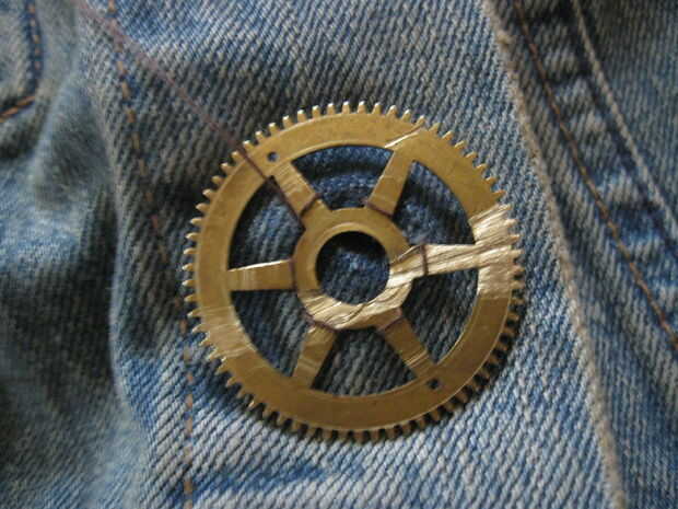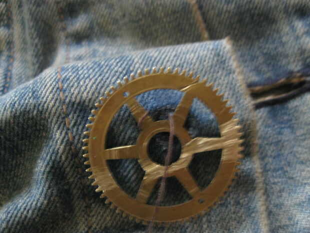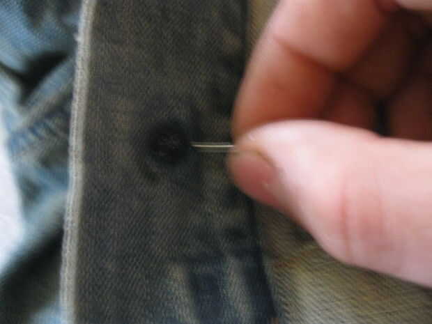 Ahora que está enhebrada la aguja, que desea poner la aguja a través del lugar donde desea que el botón, comenzando en el interior. Entonces, tire a través del espacio en el engranaje entre rayos, como se muestra en la tercera foto. Después de eso, tomar la aguja sobre el rayo y poner en la parte posterior en el derecho de la tela al lado del rayo. Ahora, tienes que aguantar el hilo a través de la tela, justo al lado del próximo rayo. Seguir adelante en los radios, y cuando has ido alrededor del engranaje entero dos veces, quiere poner la aguja a través de la tela, hacia el engranaje, pero no a través de la marcha. En cambio, desea envolver el hilo alrededor de la rosca que está entre el engranaje y la tela, teniendo cuidado de no conseguir el hilo atrapado en el engranaje. Envolver 4 veces, y luego volver en la tela. Por último, desea coser una puntada 3 veces en el mismo lugar, luego corte el hilo y un nudo para fijar completamente. corte cualquier hilo que cuelga más allá de este nudo, y ahora tiene un botón. Seguir todos estos pasos para cada botón que desee reemplazar. Las dos últimas fotos muestran este aspecto.