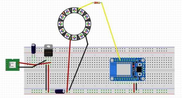 Por último cable lo ESP8266 pin #5 a la datos sobre la NeoPixel. Las mejores prácticas en las llamadas para una resistencia de 300-500 Ohm entre el pin #5 del ESP8266 y la entrada a la primera NeoPixel (DATA IN). Este resistor debe ser el final de NeoPixel del alambre para ser eficaz!