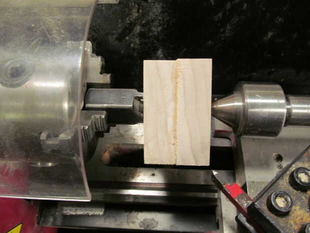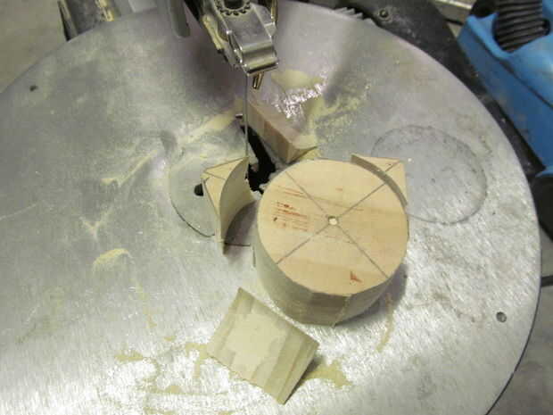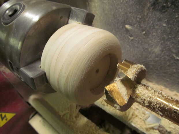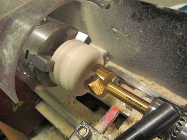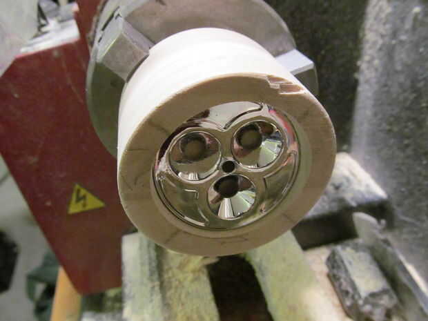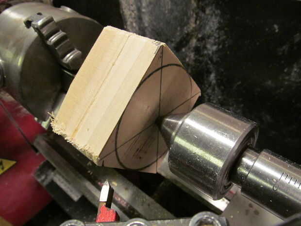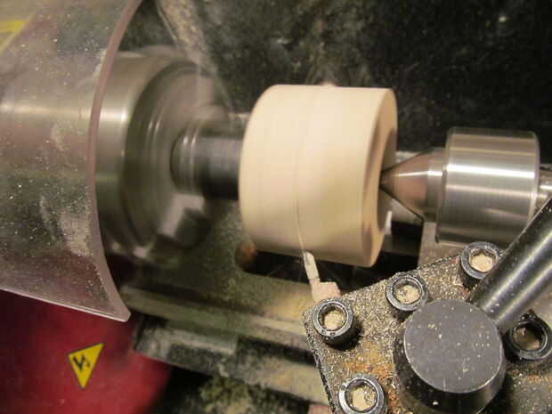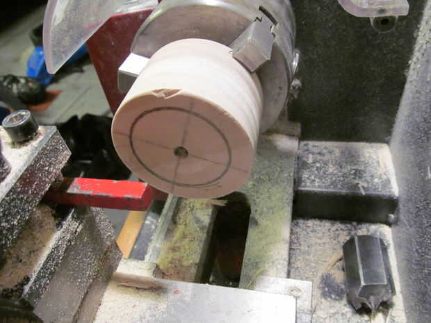 he marcado el centro con una "X" y montó mi torno. Mientras giro Marque la circunferencia. Luego corte el sobrante y montado en el. Yo trabajado a máquina fuera del recinto lo suficiente como para mantener el LED y el circuito. En el mismo lado corte un lugar para el lente de plexiglás.