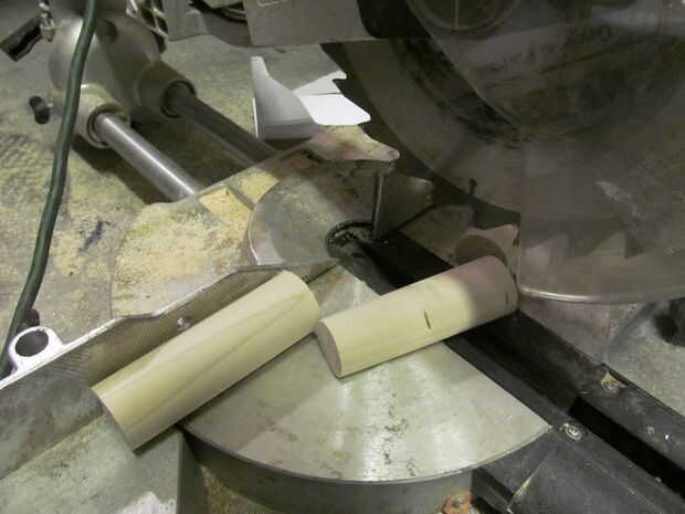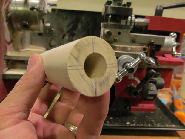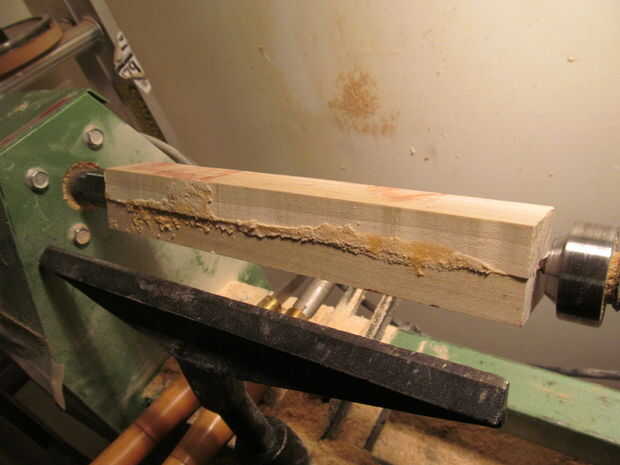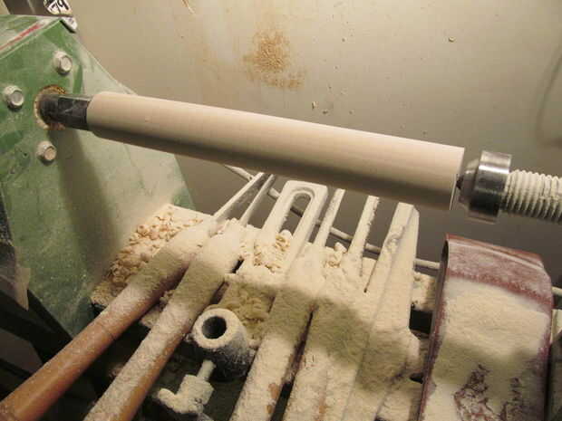 Monta el mango en blanco en mi torno para madera. Entonces hice una gran cantidad de polvo convirtiéndolo en una espiga. El mango se va estrechando en un lado lo suficiente para caber en la cabeza. Cortar solo un poco más de 2 pilas AA apiladas.