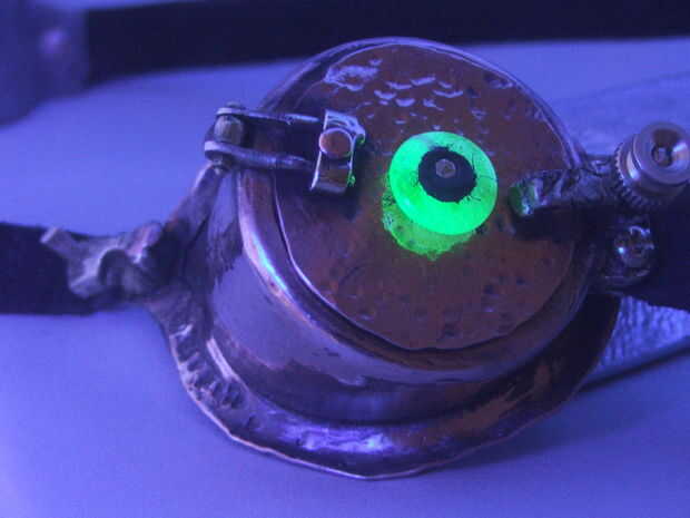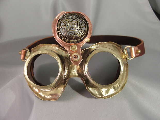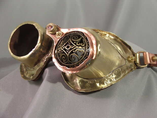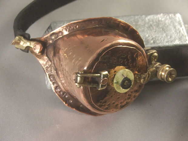 Además de la goggs Iris mecánico mostró ya tengo dos más. La primera tiene una puerta de cobre martillada que se cierra sobre el ojo derecho con un mecanismo de cierre. Para mantener a la gente de robar los ojos que supongo. Tiene steampunk, no siempre tiene sentido y no es necesario si está frío. Es fundido el metal para algunos de los accesorios de estos candados que compré en la subasta de salvamento para el asilo del este de Michigan. Este lugar fue construido a mediados de 1800 y fue demolido en el año 2000.