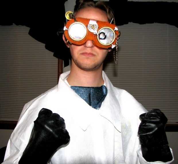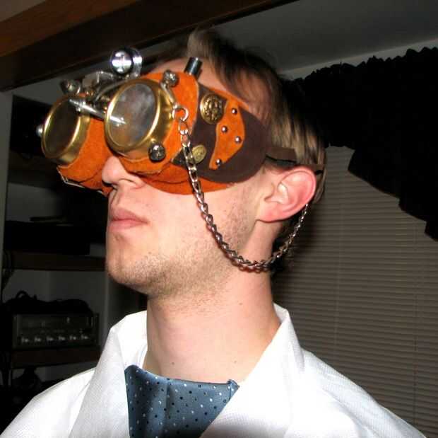 La base es un conjunto de gafas de seguridad de laboratorio chem, envuelto en cuero de disfraz de vaquero del año pasado. Casi todo es pegado en caliente en. Me encanta el pegamento caliente.