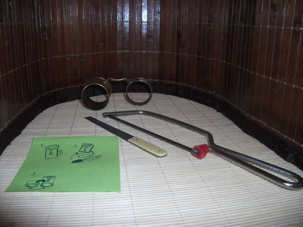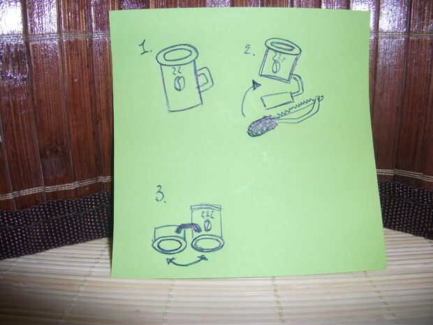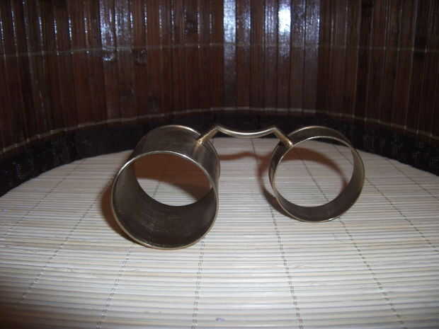Cortar una taza de metal (o latón) en dos partes sin dañar el mango. Doblando la taza hasta que tenga la forma de unas gafas. Moler y para pulir la Copa hasta que brilla y es tan delgado como sea posible. Como sólo he dibujado en la imagen siguiente.