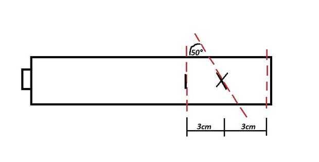 Luego se mide 3 centímetros (1.2 pulgadas) desde el extremo (marque "X") y la siguiente 3 centímetros desde que (marca "I") y como veis en la primera foto. Por cierto, los 50° grados son jjust oriental, él depents en la cara qué ángulo a elegir. Mejor que intentar primero con tubo de papel o algo y lo que te cuadre.