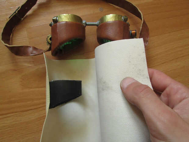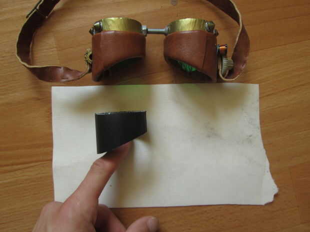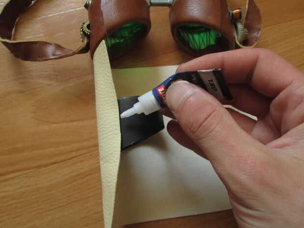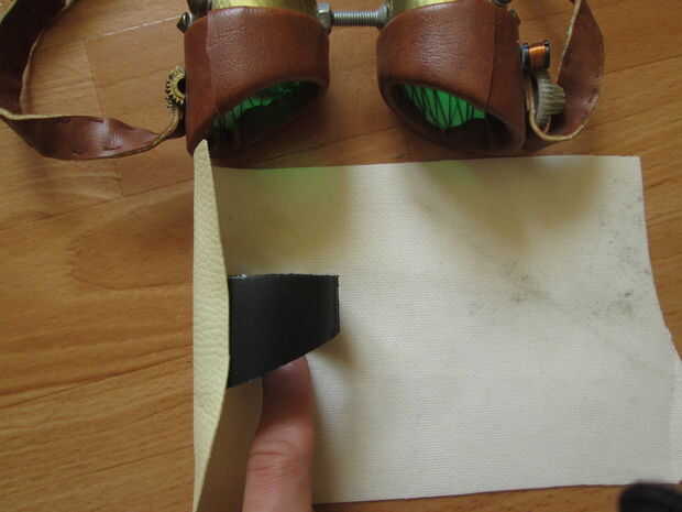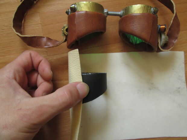 Hacerlo exactamente como ves en las fotos. Usted quiere el cuero a los traslapos en la parte inferior de la gafas ligeramente hacia el exterior. Mi inglés está oxidado, realmente debe sólo seguir las fotos :)