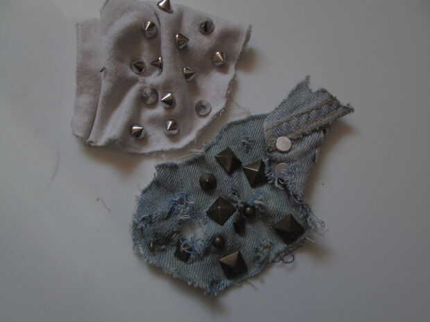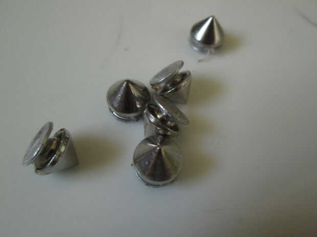 Tengo algunas Camisas viejas con picos de acero. Así que me quité la les. Usted puede encontrar espigas que pueden atornillarse en mina son como remaches, yo realmente no puedo separar estas dos partes de sí mismos. De esta manera cuando tomarlos, va a ser algo de tela. Usando un encendedor para conseguir elimina trabajos un poco, la pintura se encargará del resto.