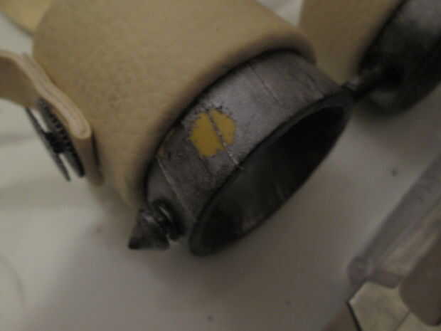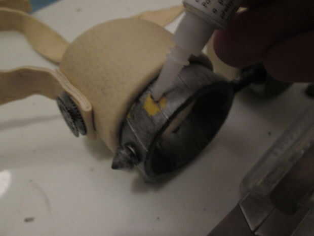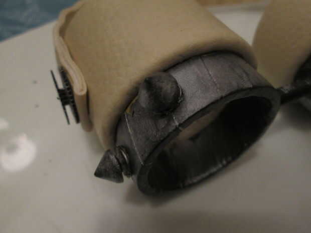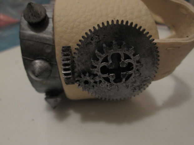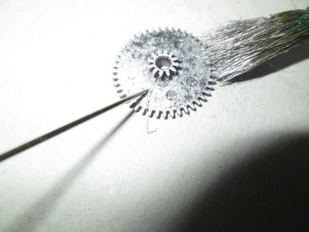 Luego pinte negro (rociado). Cuando esté seca, pinta todos los engranajes y picos de plata. Golpes ligeros, por lo que parece viejo y usado. He utilizado una aguja presionado al pintar.