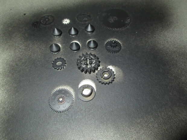 Engranajes son sobre todo de una impresora vieja, pero hay algunos de un reloj de alarma. Usar lo que tienes son de engranajes engranajes y diversidad un poco es bueno.