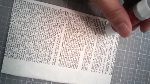 Luego corté un trozo de papel de diccionario que era unos 6" por 4". Esto es obviamente más grande que lo que es el lado de la tarjeta pero me dio una oportunidad para recortar una vez que el pedazo fue pegado.