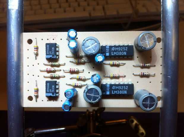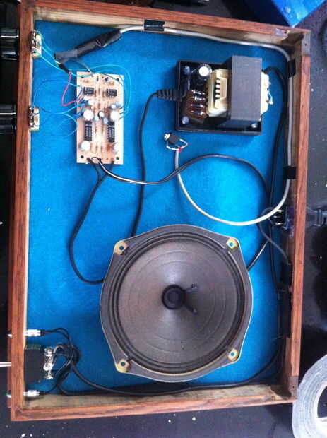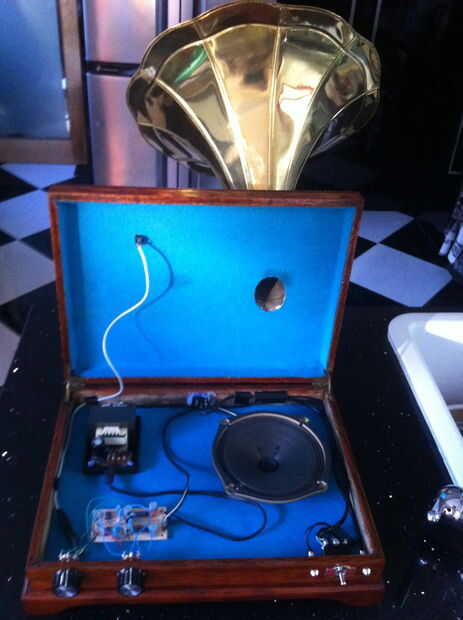 El amplificador estéreo de Mini que hice de un kit con mi titular de PCB fácil. El cableado es bastante simple ya que sólo utiliza un canal del amplificador.  Había pensado en hacer un iPhonograph estéreo pero no pude colocar dos cuernos de cobre amarillo en la caja.  Por favor pregunte si tiene alguna pregunta acerca de la electrónica.  Creo que las fotos le ayudará.