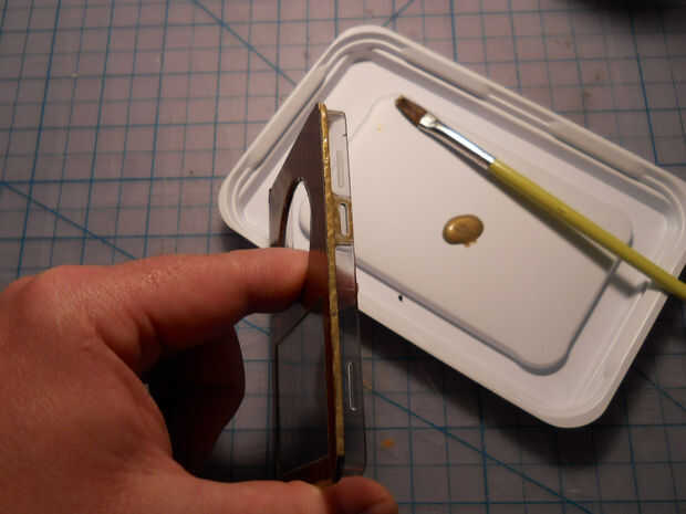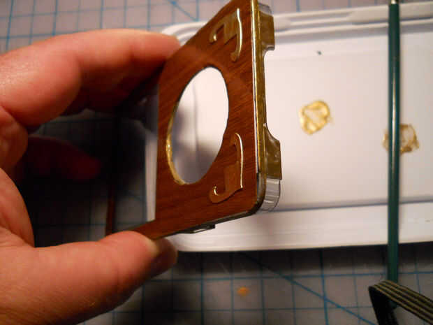Con un cepillo pequeño y alguna pintura metalizada, pintura cuidadosamente los bordes de la caja delantera (los que estarán expuestos) y el borde interno del disco redondo donde los controles se muestran a través de.