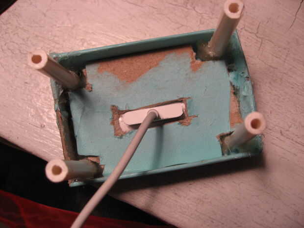 Ahora usted tendrá que cortar el cable de carga y el conector para base dock para que encajen. Después de esto, pegue el soporte de muelle en el agujero que fue cortado para él. Luego cortar 4 trozos de 2 pulgadas de barra de plástico. Hacer agujero para los 4 tornillos pequeños con un alfiler y luego caliente pegamento en su lugar. Antes de la pega se seque, añadir las barras de plástico en el lugar de donde salen las protuberancias del tornillo. Una vez que todo esto se pega en, cortar un trozo de cartón a ritmo sobre todo de pegamento caliente y pegamento en su lugar. Ahora estás con el muelle real. Si desea, puede pintar esto y se considera terminado. Pero fui hacer la base