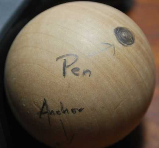 Pluma y fondo de taladro en la madera de la bola. Marque uno en la parte inferior y un agujero (1/8") de la pluma (1/4").