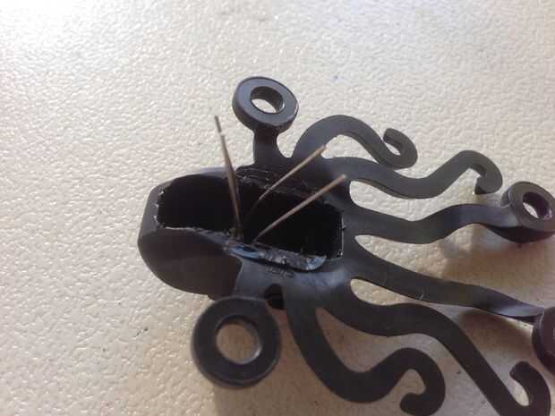 - Pegar el portapilas al pulpo con sólo un par de lenguados. Debe sostenerse juntos bastante bien.