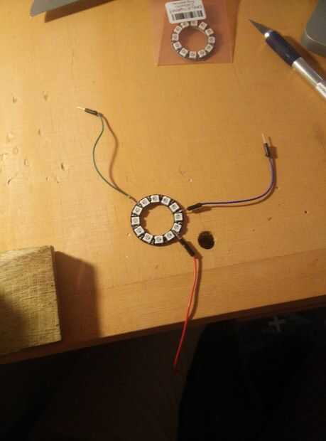 Soldar tres cables en el + / - y las piernas de la señal de la Neopixel anillo y conectado a tres de los cables en un enchufe USB macho. Luego conecté una hembra de enchufe del USB para arduino en 5V / Gnd y una señal de habían salida pin, de modo que pude conectar este proyecto o cualquier otro proyecto de tres hilos en el Arduino fácil.