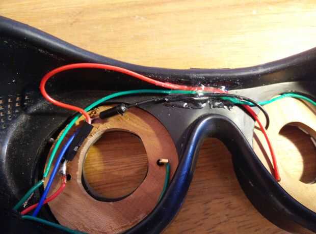 I luego supeglued los LEDs a la madera después de perforar los agujeros para los cables. Un poco de pegamento caliente celebró los alambres juntos las gafas (ver fotos).