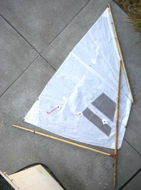 Hice para un kayak tandem en 2004 cortando la cabeza y el pie apagado una vela de windsurf viejo agradable.