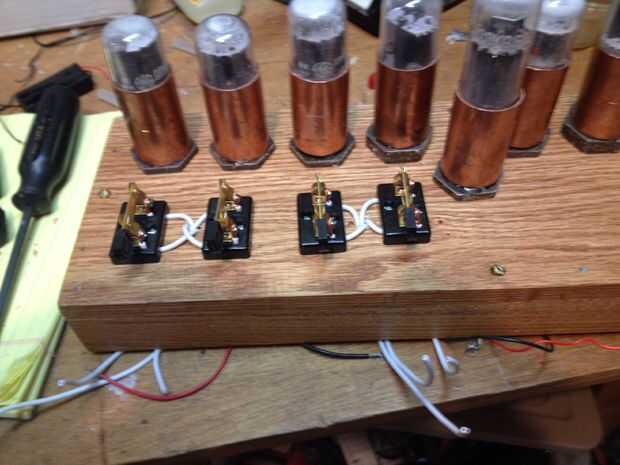 3. Conecte los cables a cada lado de cada interruptor de cuchillo y darles de comer a través de los agujeros de 5/16 de pulgada.  Usé un agujero para cada dos interruptores.