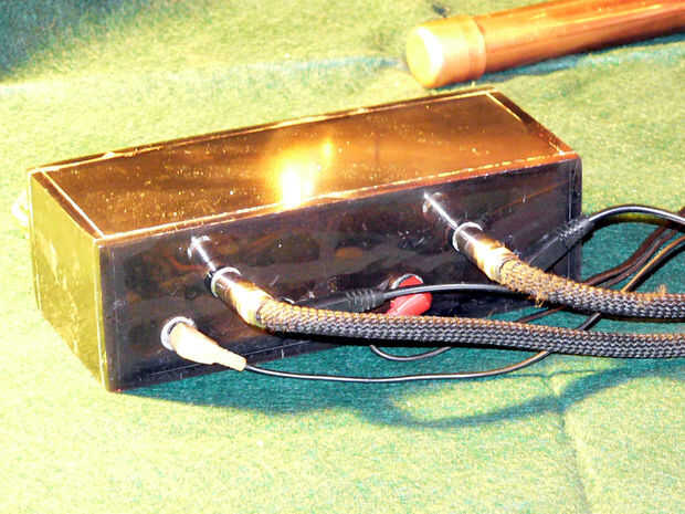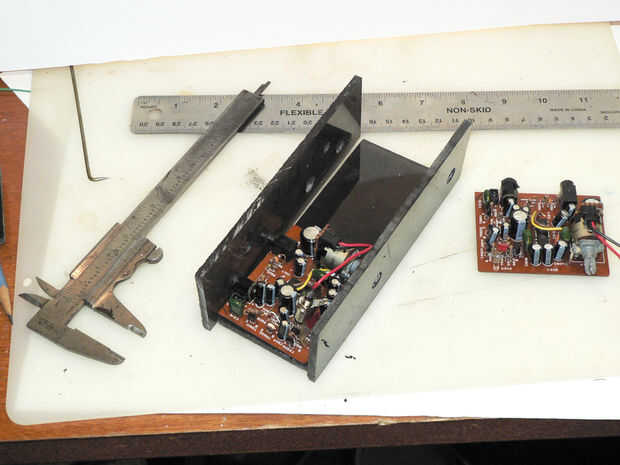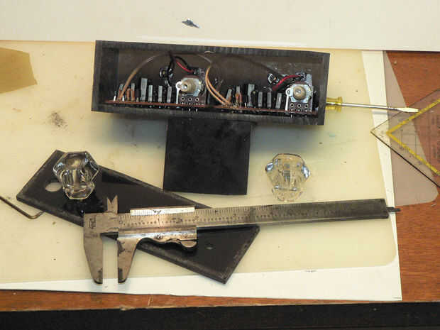 Así que de nuevo a mi recinto. Con cuidado y precisión me mide la ubicación de las entradas de sonido y actuales, así como la ubicación de la perilla de volumen ya que no parecía posible para mí desoldar de la placa. Por consiguiente perforó agujeros en las piezas delanteras y traseras. Por supuesto no encajan como parecía que era jinxed este proyecto. Con alguna ampliación de los agujeros y algunos presentación pude poner piezas frontales y traseros exactamente en el lugar. El pegamento especial de soldadura en #16 (http://www.ipscorp.com/assembly/acrylic) establece durante la noche pero es muy fuerte. Para darle ese aspecto viejo de tiempo, he utilizado vidrio cajón sabe para el regulador de volumen.