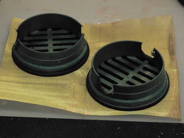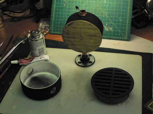 Navegación a través de la tienda encontré la caja derecho para mis altavoces externos. Casquillo de la pipa del PVC de 4" y 4" PVC piso de drenaje. Pintado de negro y el frente cubierto con malla de latón (en la tienda de hobby) deben dar el look adecuado. Éstos Unido posteriormente al marco del monitor con 1/2"(cita) adaptador macho de presión de cobre, Copa x MIPT (macho NPT hilo de rosca) jajaja, bueno, que es el nombre científico para él.