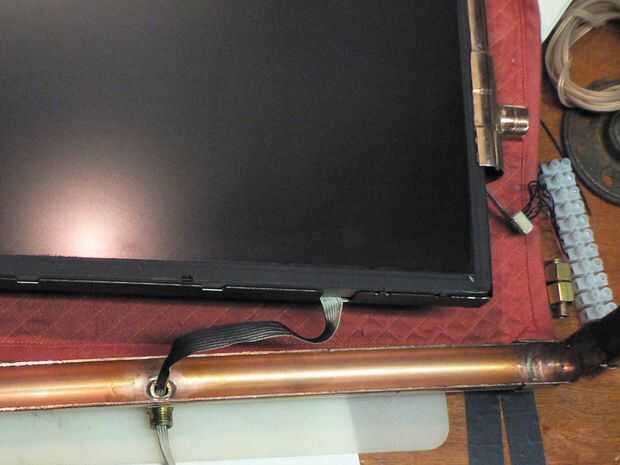 en este proyecto, encajona un monitor Envision EN7750 LCD en un marco de madera de roble rojo con una incrustación de madera pluma.  La base se dirige hacia fuera para adaptarse a la base del monitor.  Los lados tienen ranuras cortadas en ellos a los
