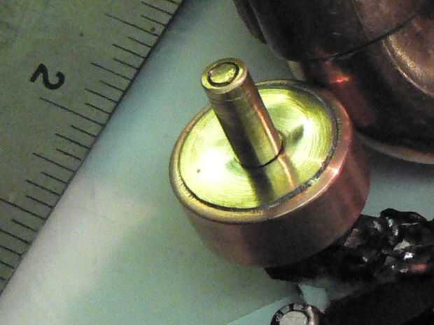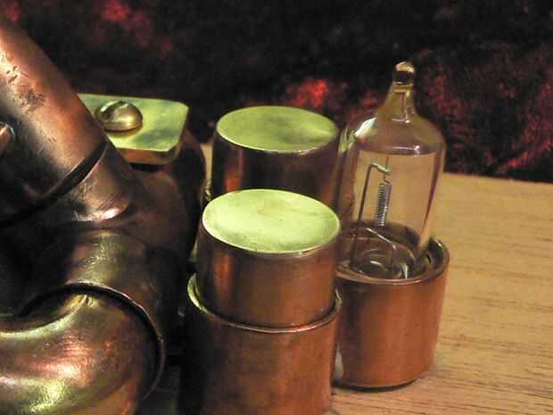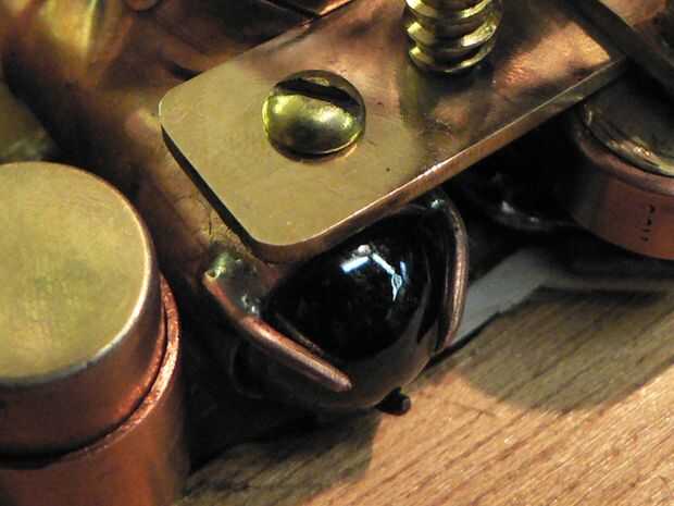 Canicas tenía en un plato como decoración encajan perfectamente en el tubo de cobre y haría un 'ojo mágico'. Una vieja bombilla halógena iluminada por el LED azul original del ratón y ajuste, con colocar cuñas, en un tubo de 1/2". También he añadido el cobre hecho a sí mismo y rueda de latón.