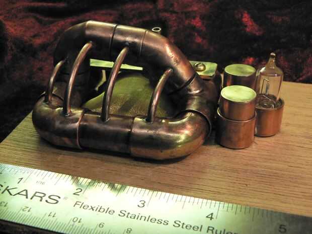 Esta parte no está tan bien documentada y debe usted abordar su propio ratón steampunk, supongo de todos modos encontrará sus propios métodos. Tengo un don para tubo de cobre, que debería ser obvio. Es como el LEGO. Agregar un pedazo aquí, una parte allí y mi ratón toman forma. En el lado izquierdo que necesitaba hacer un nuevo cojinete de la rueda de pulgar. La parte inferior construida hoja de estireno adicional. El detector de dirección pegado, en la parte superior un soporte de latón para el árbol construido. En el lado derecho hicieron una ' jaula de calibre 10 alambre de cobre (donde que provienen?) que trabaja bien como apoyo. En este punto del tiempo la tubería de cobre y guarniciones fueron ya soldadas juntos. He intentado perforar tan uniformemente como sea posible, más o menos lo echando un vistazo. (También visible mi intento en una nueva clave para el pronto a venir steampunk teclado).