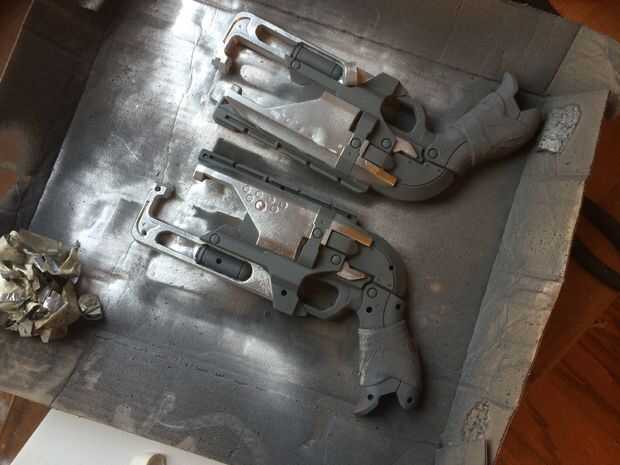 Ahora que la cáscara fue hecha lo llevó fuera y le dio una mano de imprimación gris para ayudar a que la pintura se adhiere aún más. La pintura de aerosol de plata era una prueba pero resultó para ser demasiado brillante para esto por lo que había desechado. Volvió sobre la cosa entera con bronce martillado como una capa base, luego grabó la mayoría de él para agregar el cobre en ciertos lugares. Una vez que los dos se hicieron roció el mango marrón para oscurecer la madera de la textura. Grabado sobre el original "paño" en el mango para salvar de toda la pintura de aerosol.
