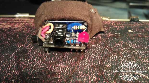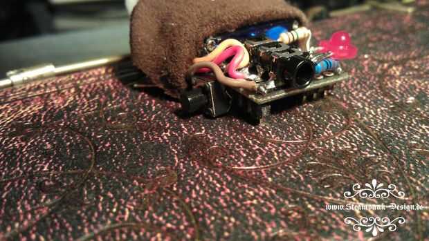 Entonces soldadura de las dos resistencias, cables servo, LED e interruptor en el módulo (AXE230) y el ajuste a la tapa de la misma manera como la fila del interruptor, justo detrás de la servo.