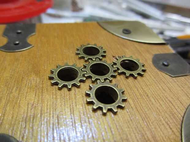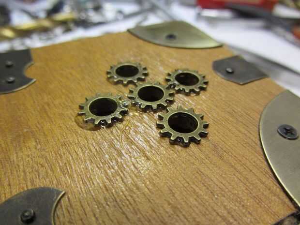 He encontrado varios engranajes pequeños con grandes agujeros para los botones para pasar a través y usado como marcos para cada ojal. Se veían bastante bien.