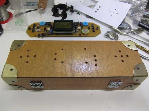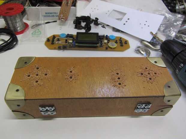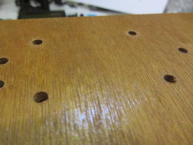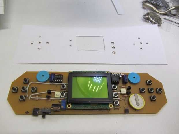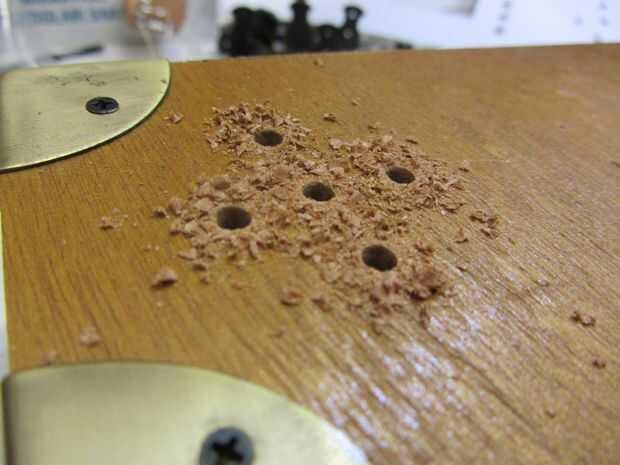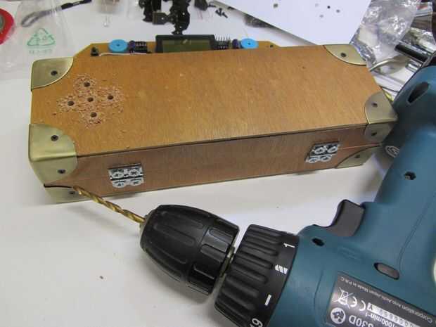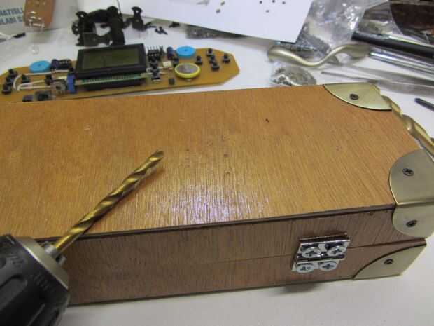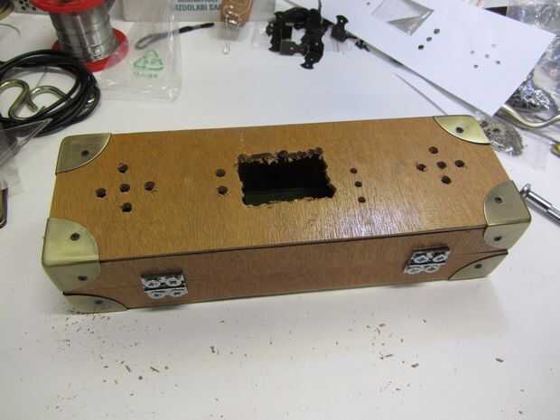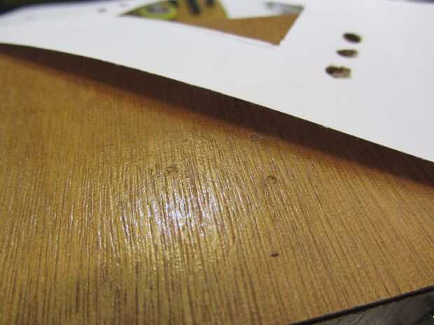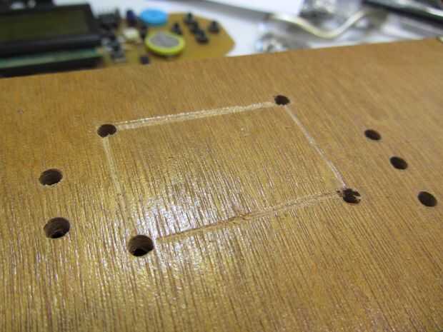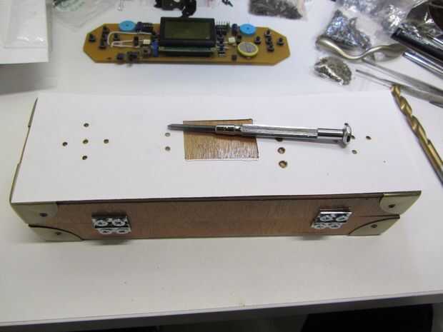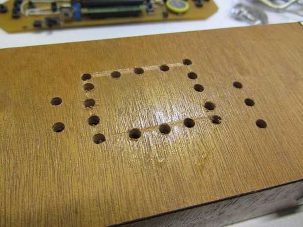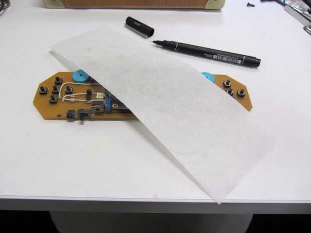 Los botones exteriores que se realizará en estilo steampunk apto presionará los microinterruptores en la placa. Por lo tanto debe haber agujeros encima de cada botón. Yo he firmado los lugares de cada botón en un papel transparente para utilizar de plantilla para taladrar.