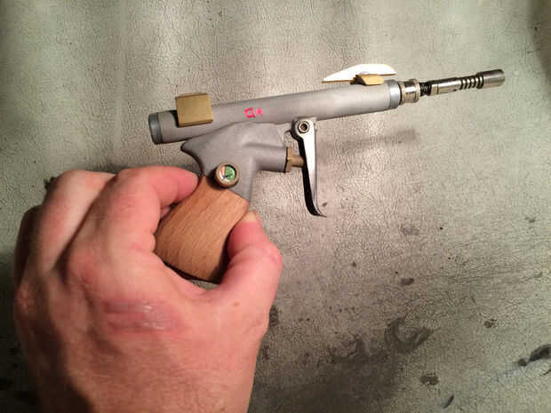 este galardonado RAY GUN fue montado por mi de objetos encontrados. Algunas de las piezas más reconocibles son: el cuerpo de aluminio pulido de un aspirador viejo. Parte de una vieja cafetera de café de gran tamaño. Una lente de luz de cola Ford Gala
